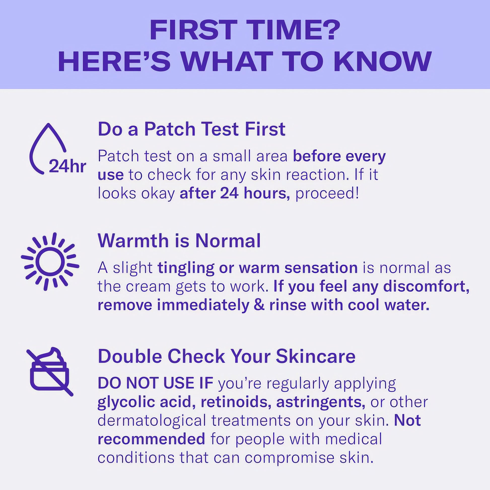Spot test. Before every use, always check for the reaction of your skin by applying Facial Hair Removal Cream to a small part of the area you're treating, following the instructions for use. If after 24 hours there is no adverse effect, you can go ahead with the application. Irritation or allergic reaction may occur with some people, even after prior use without adverse effect.